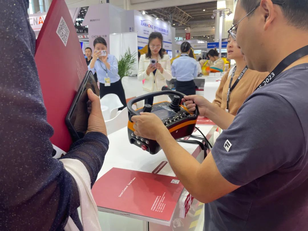 无人化也是本次展会的核心之一,在展台另一侧,多款无线遥控设备也得到了客户的广泛关注。eTelecom系列遥控系统,发射器面板可根据客户的功能需求进行非标定制,面板可以安装单轴遥控、双轴遥控、电位计、选择开关、拨动开关等。不仅品质可靠,并且采用符合人体力学的腰跨式设计,在工程机械、林业机械、港口机械等领域广泛应用。